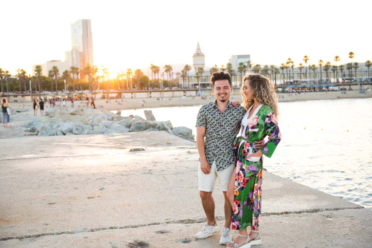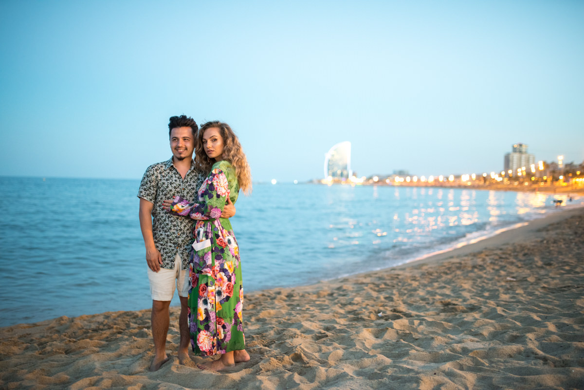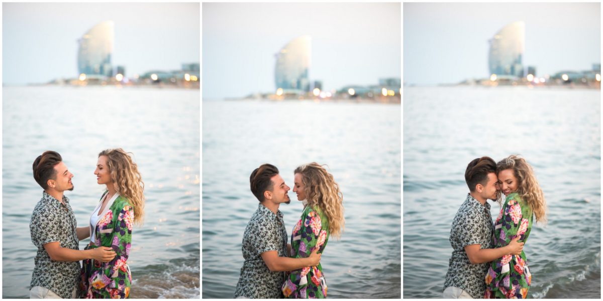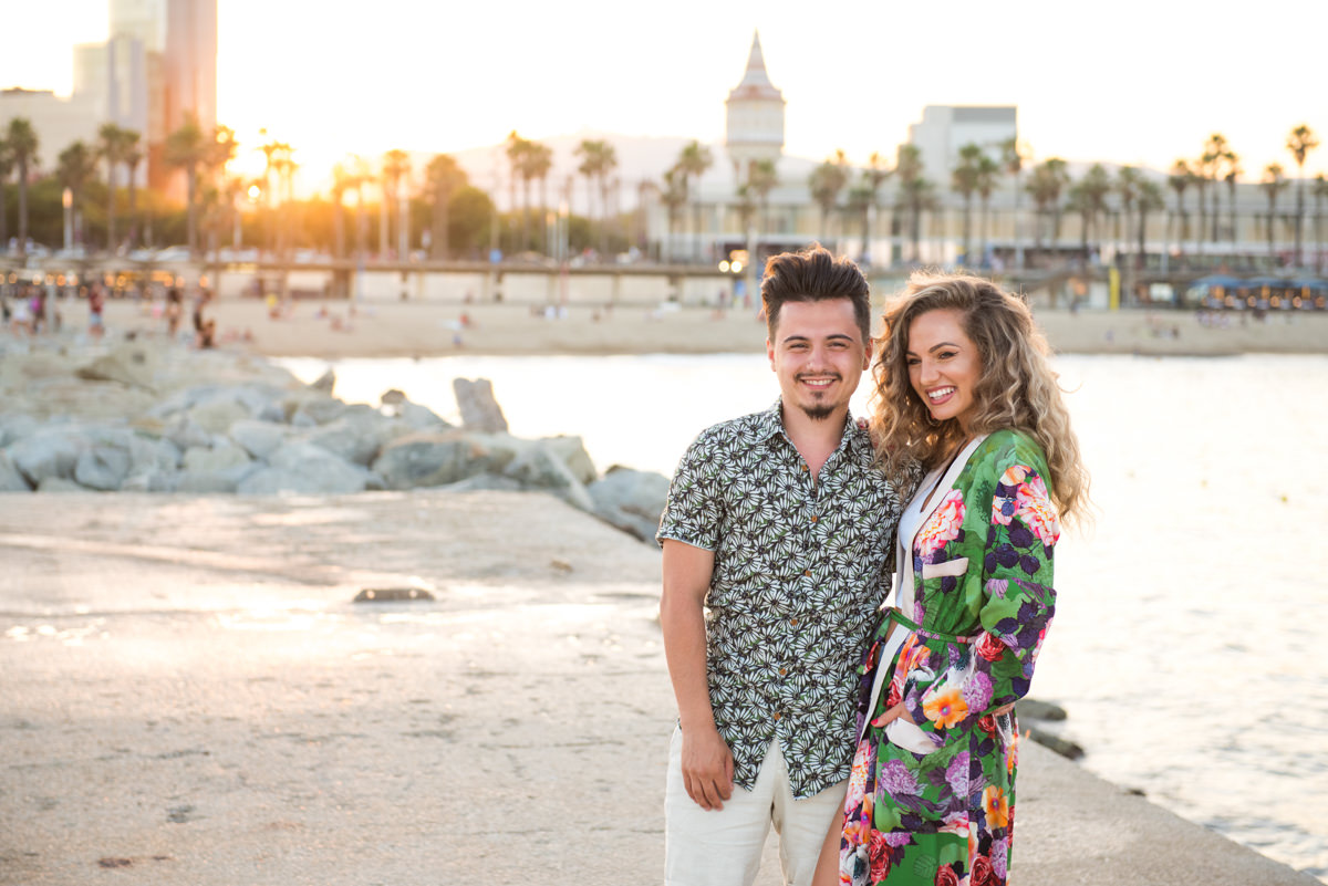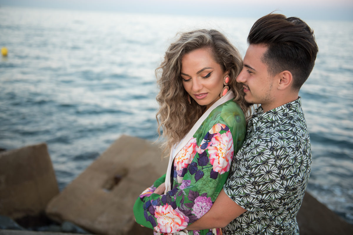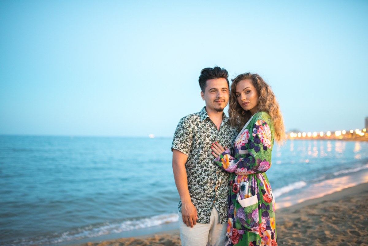 El reportaje lo realizamos un fin de semana, por la tarde, en la playa de Barcelona, con la ciudad sumergiéndose en la noche. La puesta de sol nos regaló momentos espectaculares de luz y Denisa y Stefan nos regalaron retratos muy naturales. Queríamos sorprenderlos tal como son: felices, enamorados, tímidos, alegres; y creo que logramos nuestra meta. Me costó muchísimo no subir todas las fotos.
