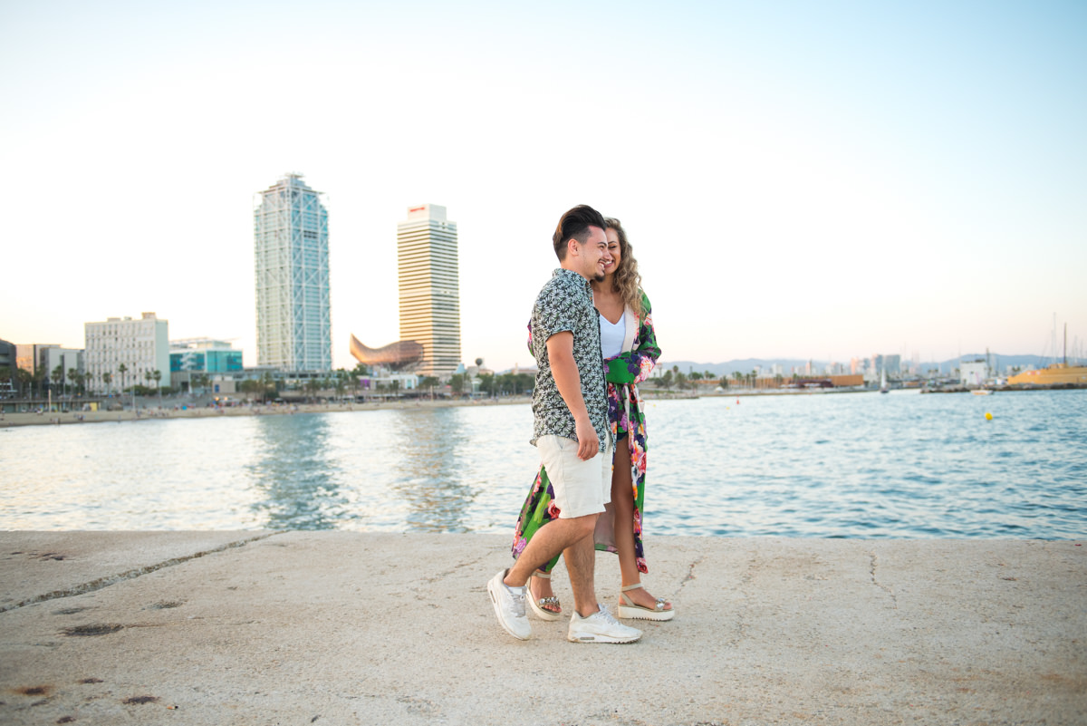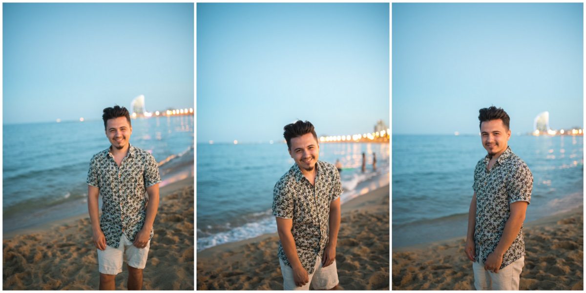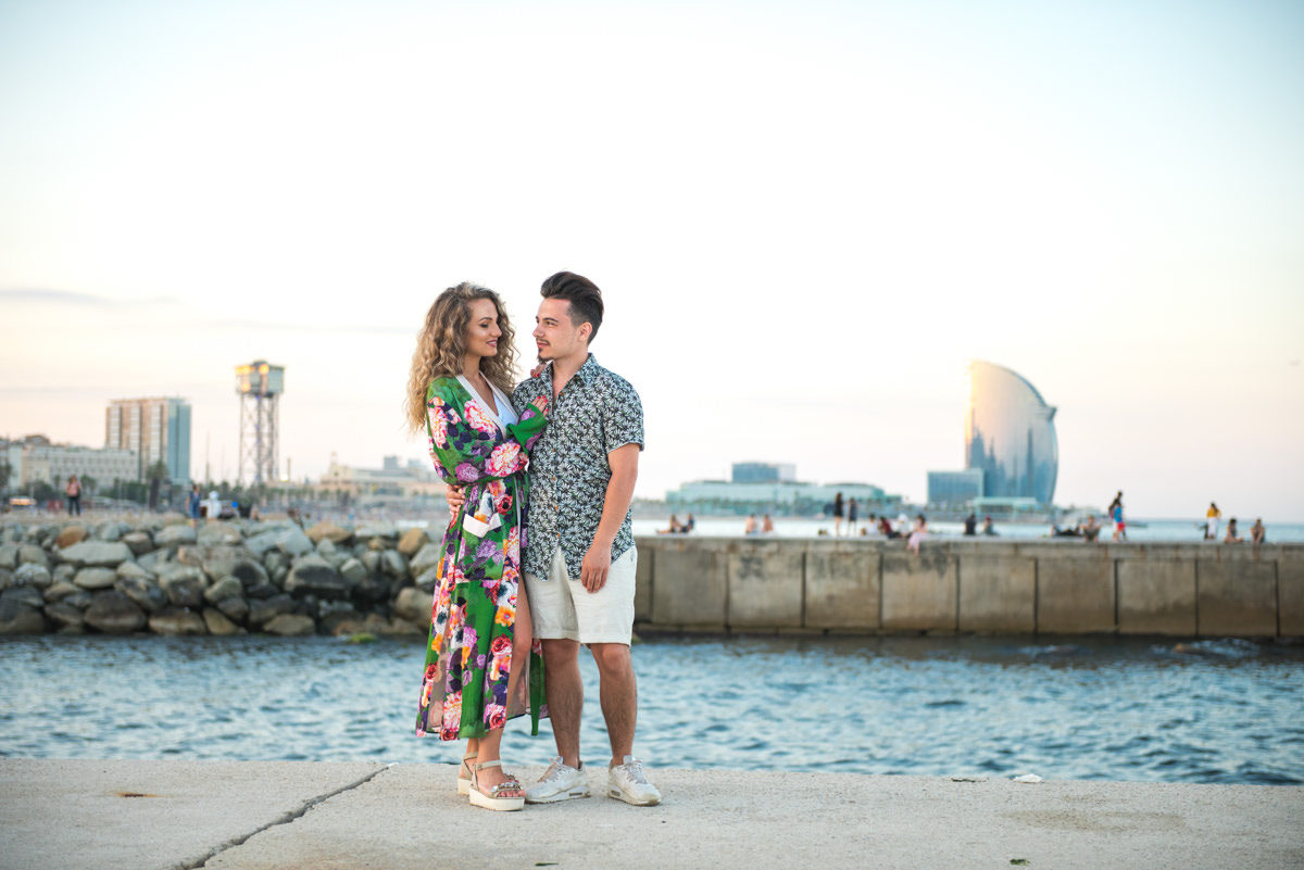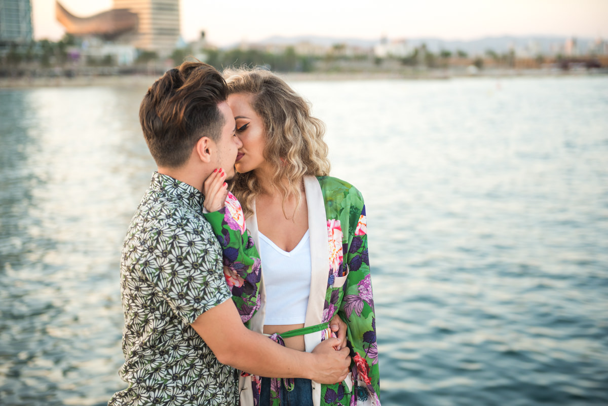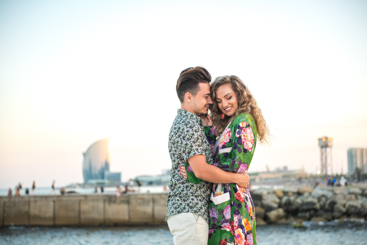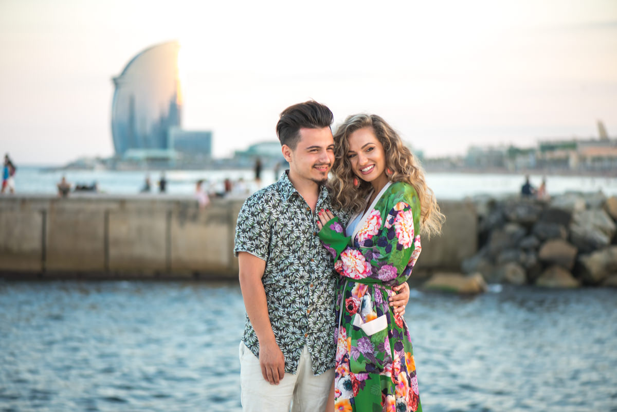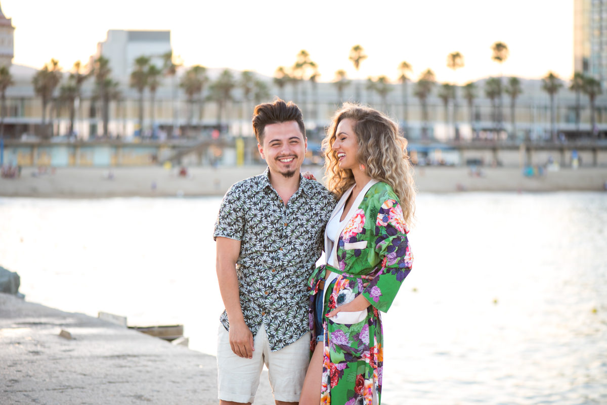 El reportaje lo realizamos un fin de semana, por la tarde, en la playa de Barcelona, con la ciudad sumergiéndose en la noche. La puesta de sol nos regaló momentos espectaculares de luz y Denisa y Stefan nos regalaron retratos muy naturales. Queríamos sorprenderlos tal como son: felices, enamorados, tímidos, alegres; y creo que logramos nuestra meta. Me costó muchísimo no subir todas las fotos.