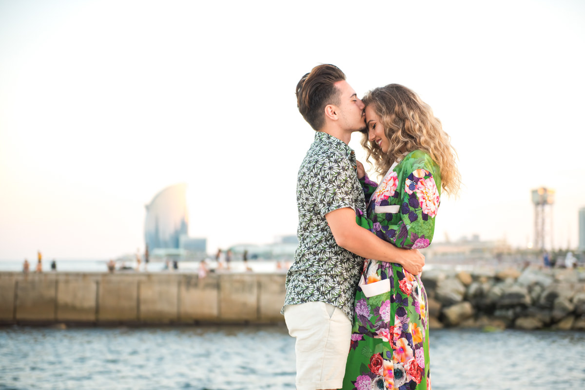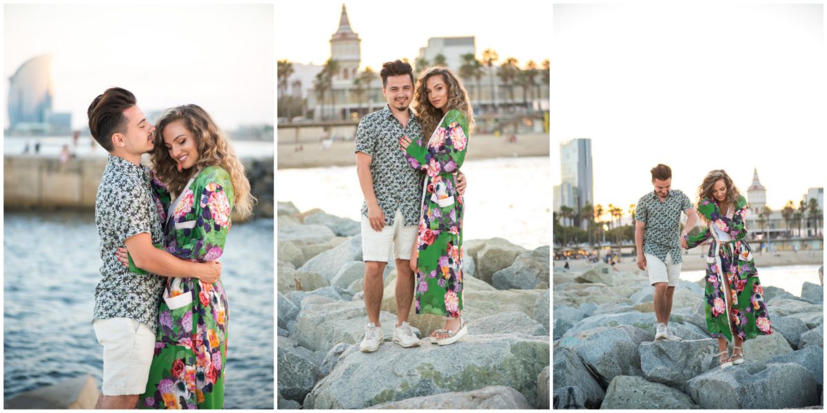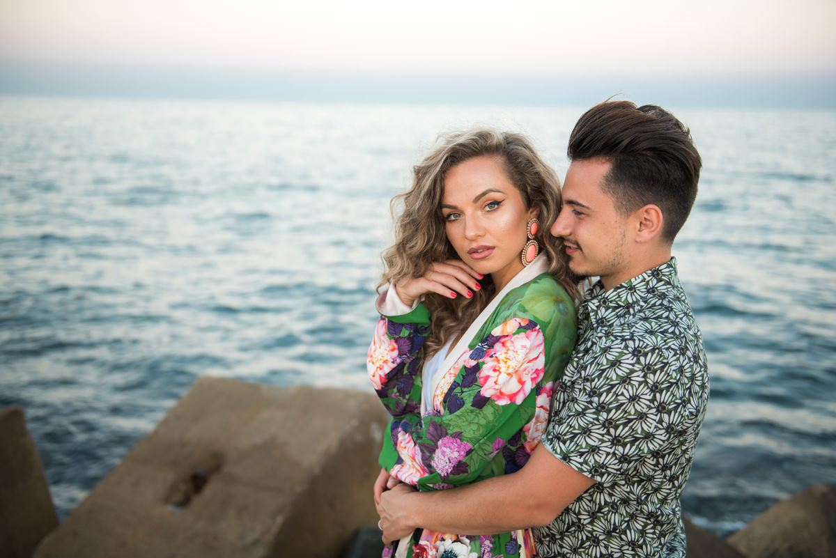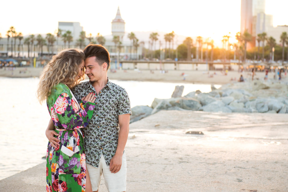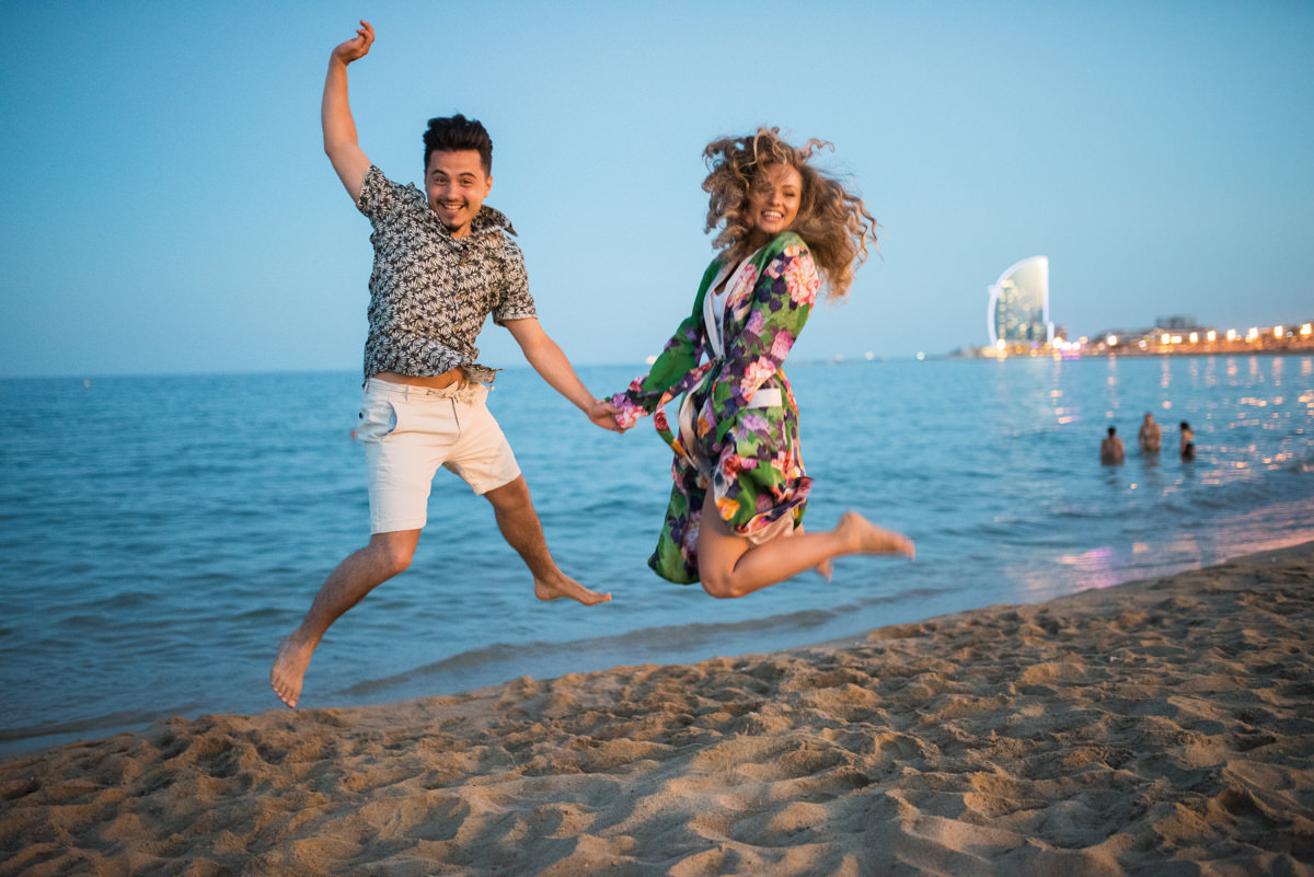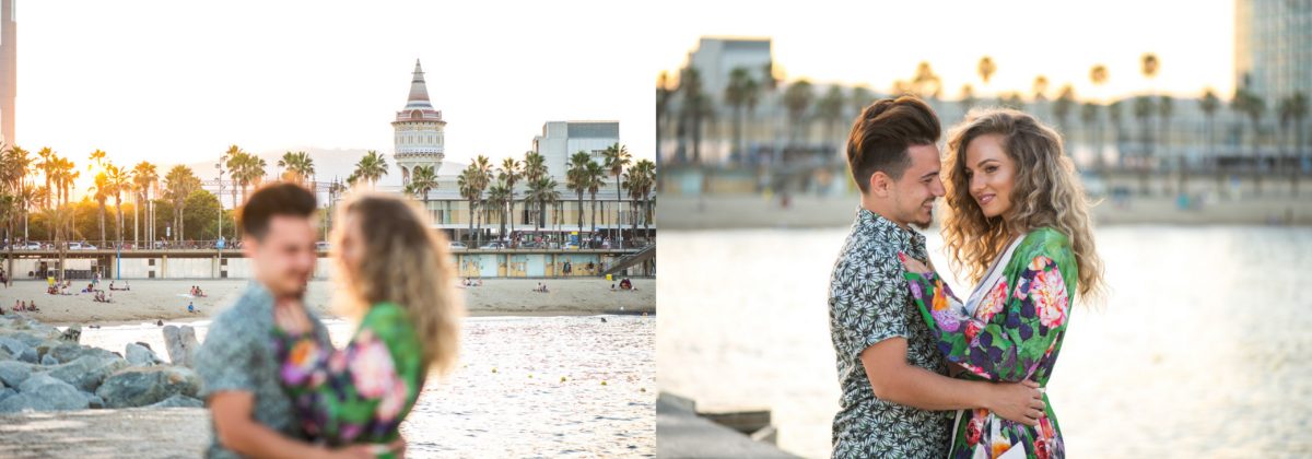 El reportaje lo realizamos un fin de semana, por la tarde, en la playa de Barcelona, con la ciudad sumergiéndose en la noche. La puesta de sol nos regaló momentos espectaculares de luz y Denisa y Stefan nos regalaron retratos muy naturales. Queríamos sorprenderlos tal como son: felices, enamorados, tímidos, alegres; y creo que logramos nuestra meta. Me costó muchísimo no subir todas las fotos.