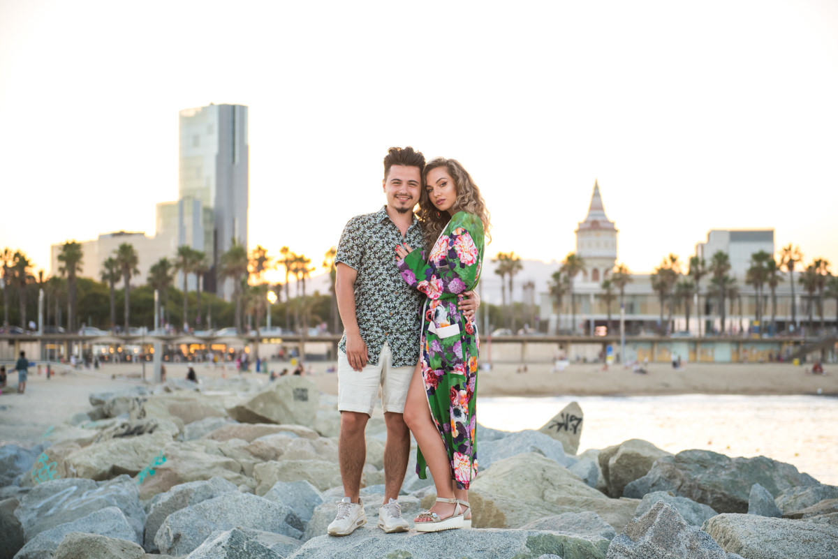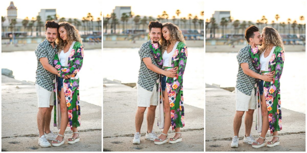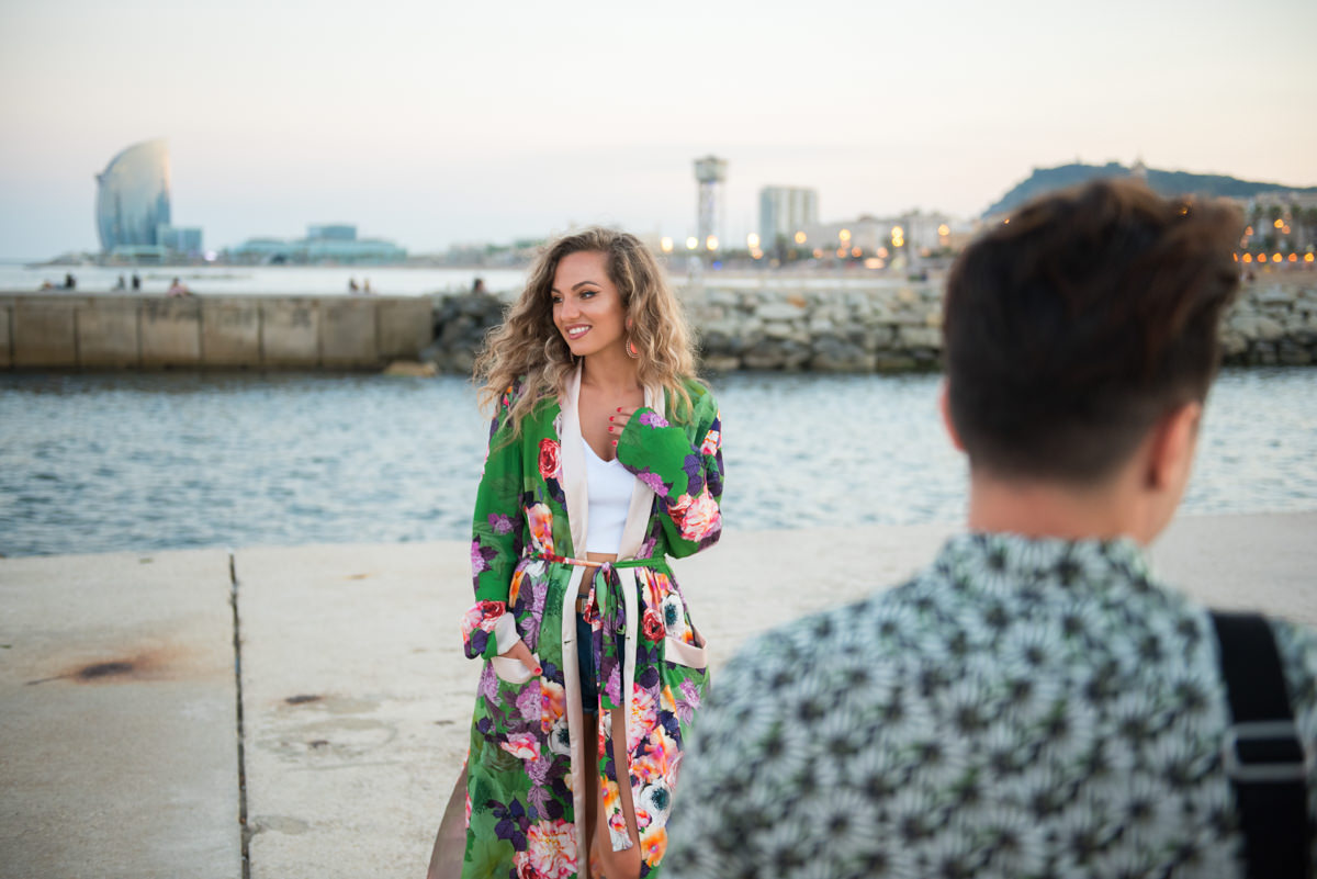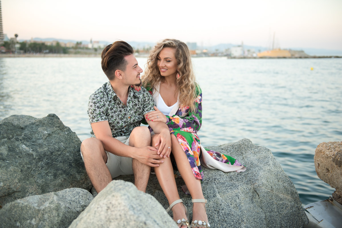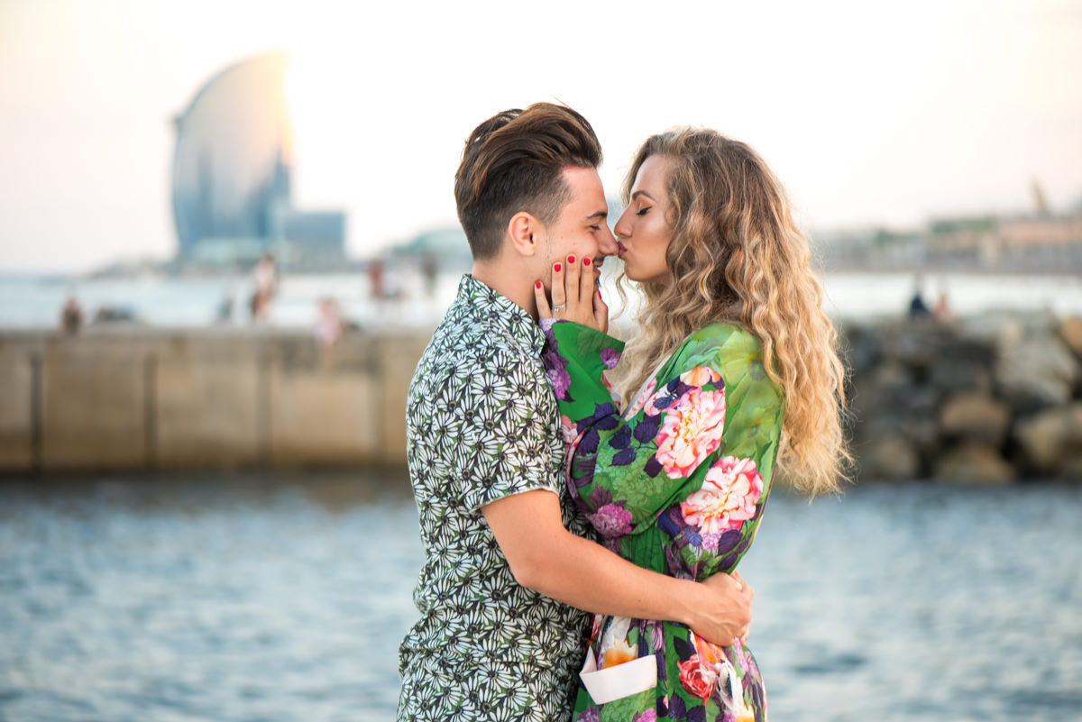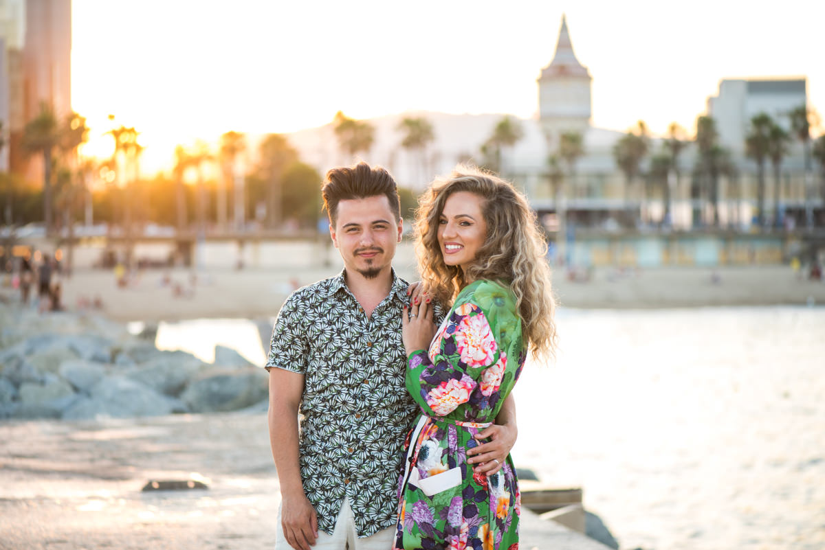 El reportaje lo realizamos un fin de semana, por la tarde, en la playa de Barcelona, con la ciudad sumergiéndose en la noche. La puesta de sol nos regaló momentos espectaculares de luz y Denisa y Stefan nos regalaron retratos muy naturales. Queríamos sorprenderlos tal como son: felices, enamorados, tímidos, alegres; y creo que logramos nuestra meta. Me costó muchísimo no subir todas las fotos.