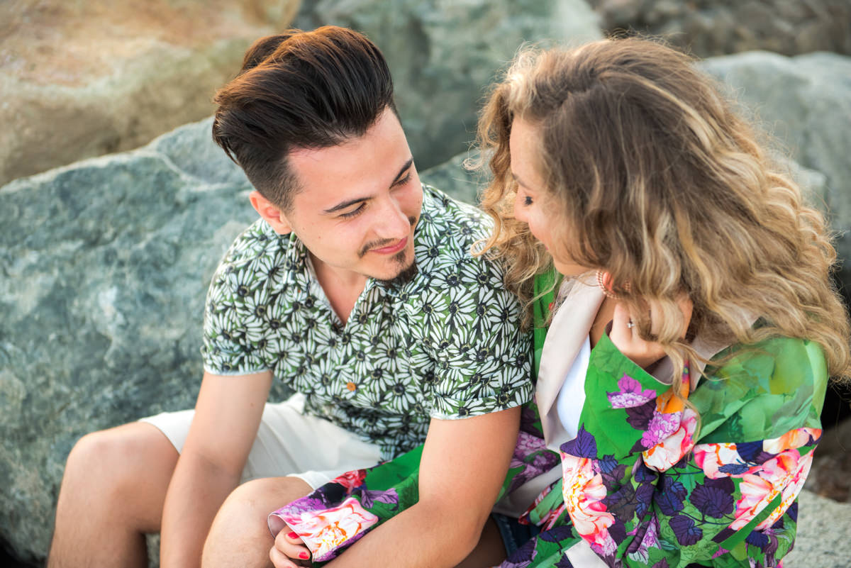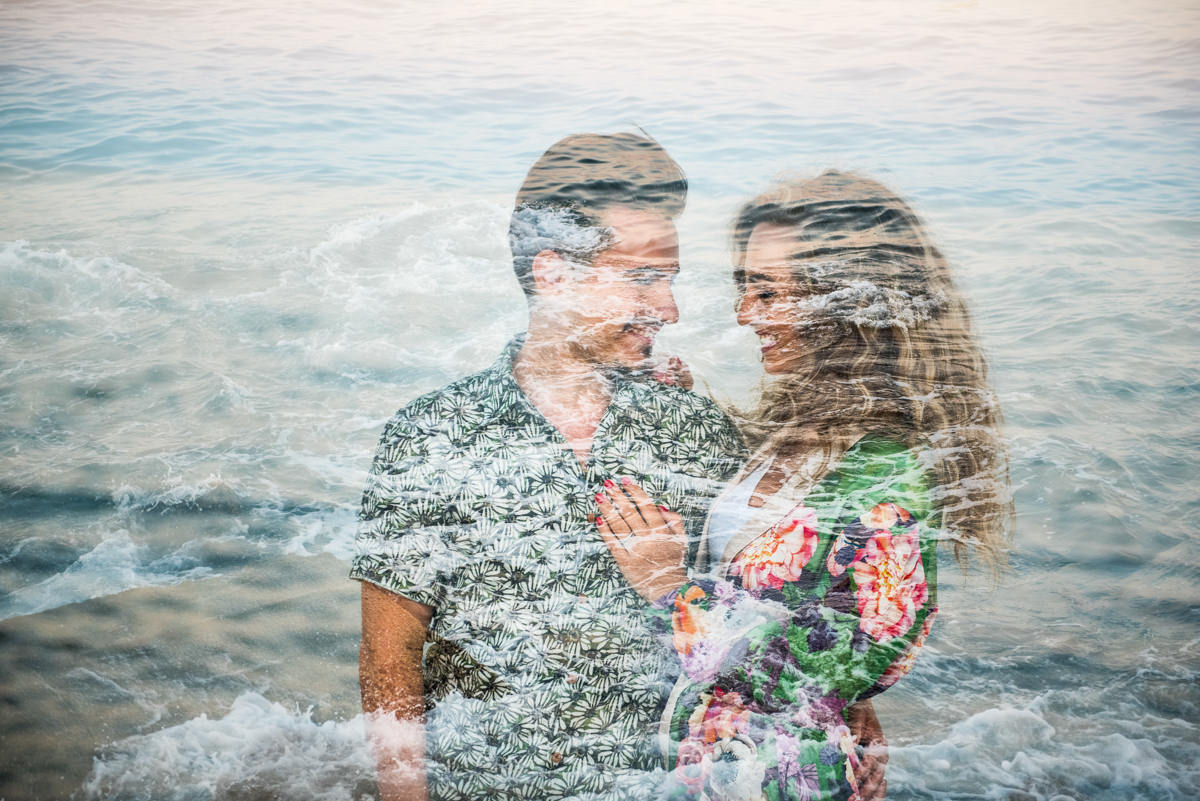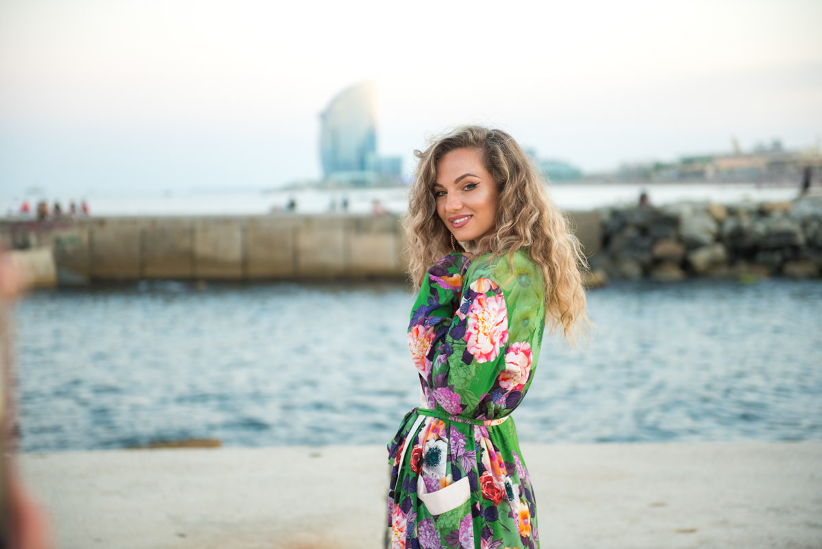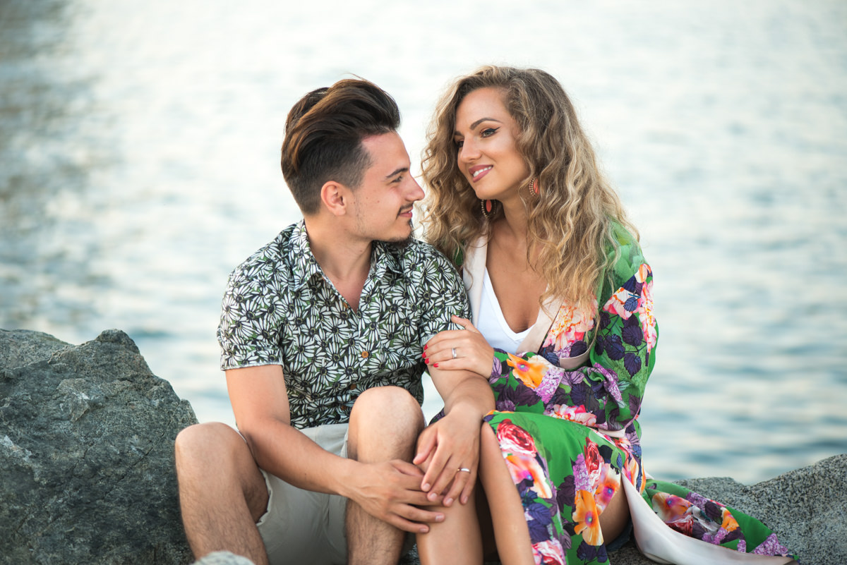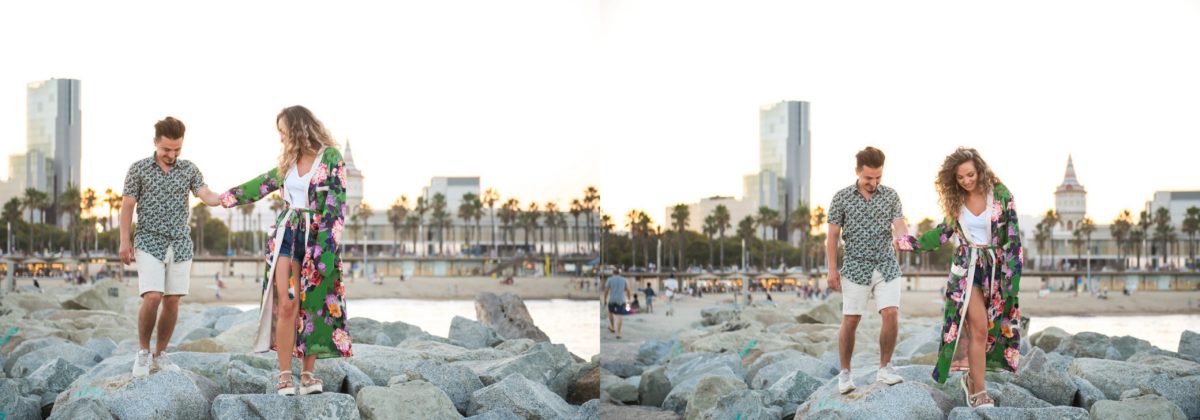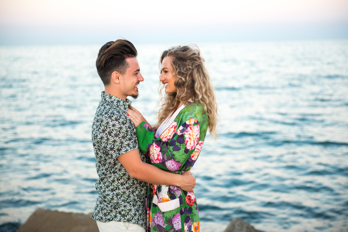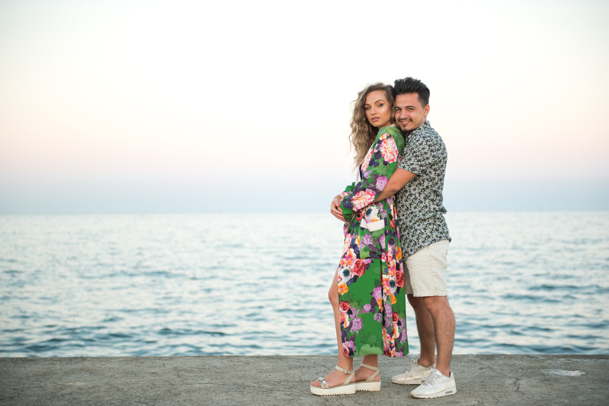 El reportaje lo realizamos un fin de semana, por la tarde, en la playa de Barcelona, con la ciudad sumergiéndose en la noche. La puesta de sol nos regaló momentos espectaculares de luz y Denisa y Stefan nos regalaron retratos muy naturales. Queríamos sorprenderlos tal como son: felices, enamorados, tímidos, alegres; y creo que logramos nuestra meta. Me costó muchísimo no subir todas las fotos.