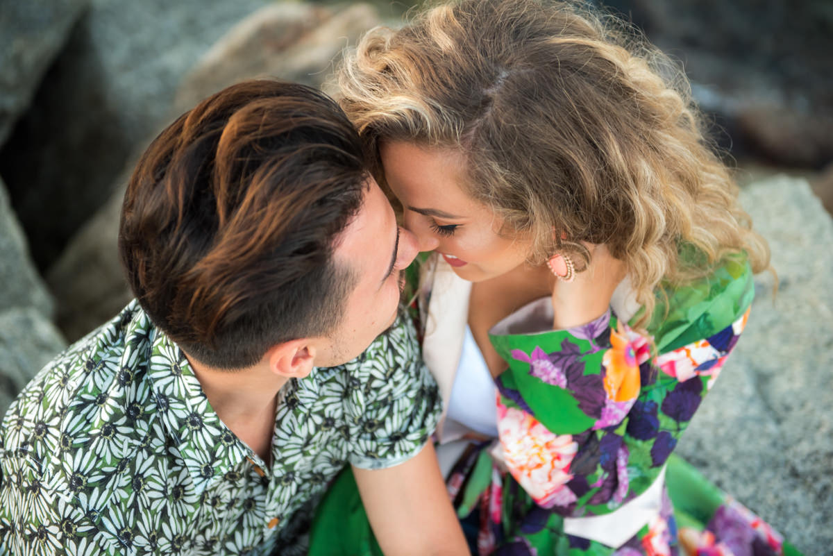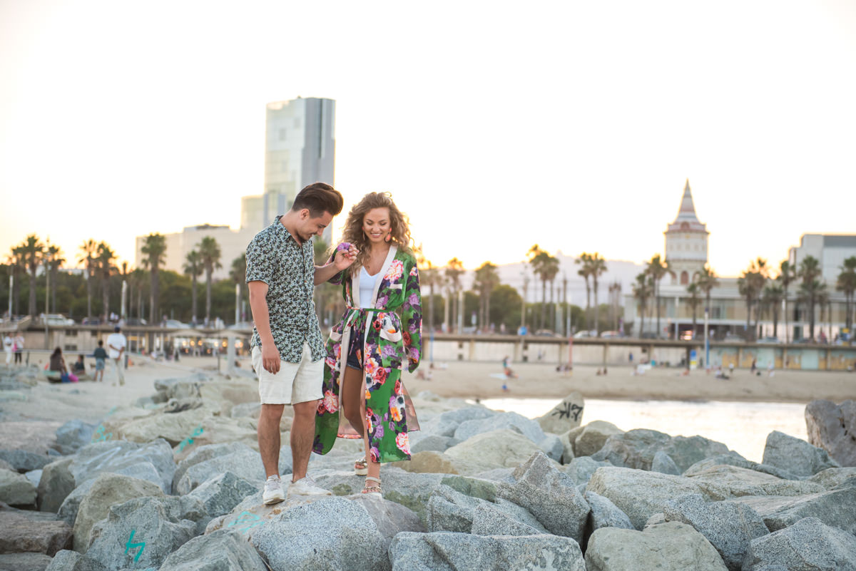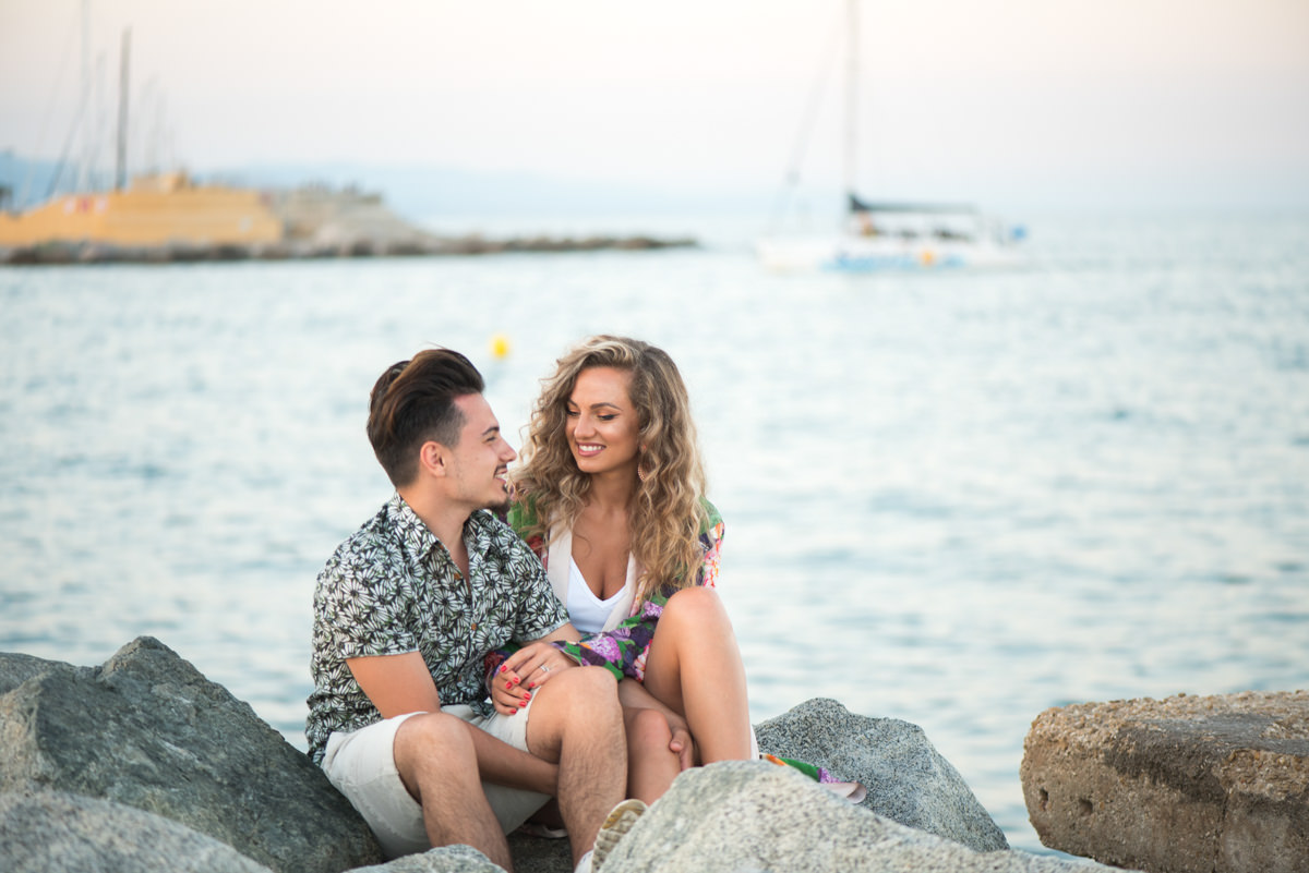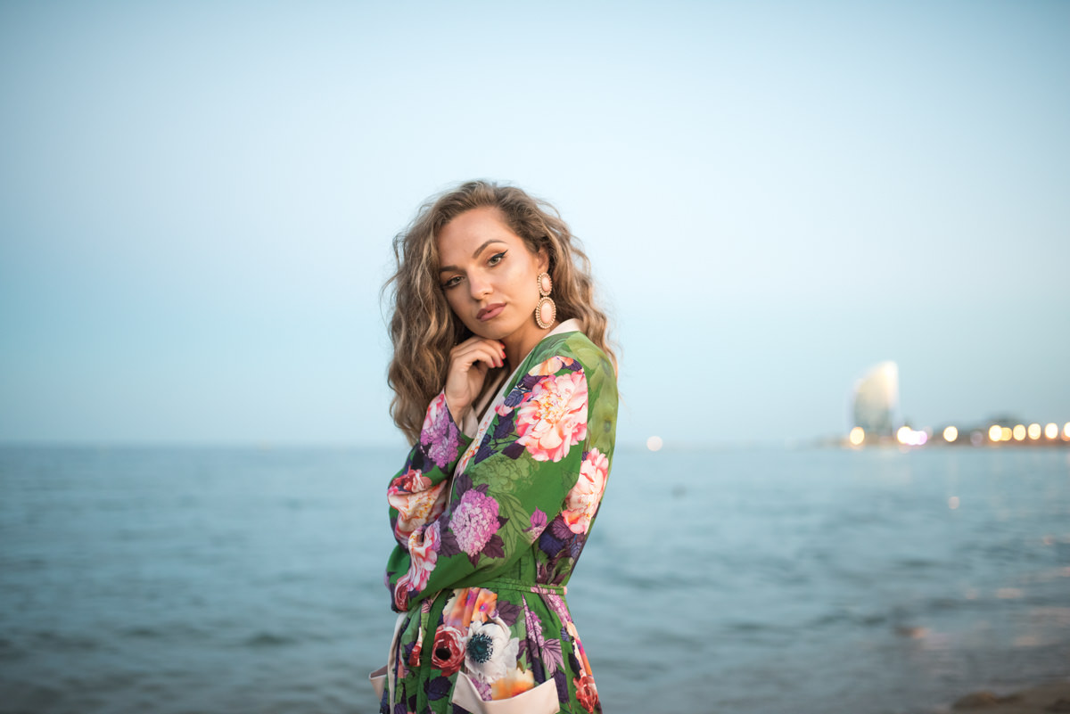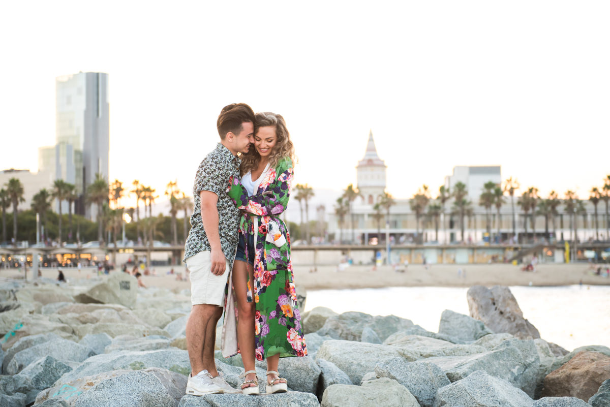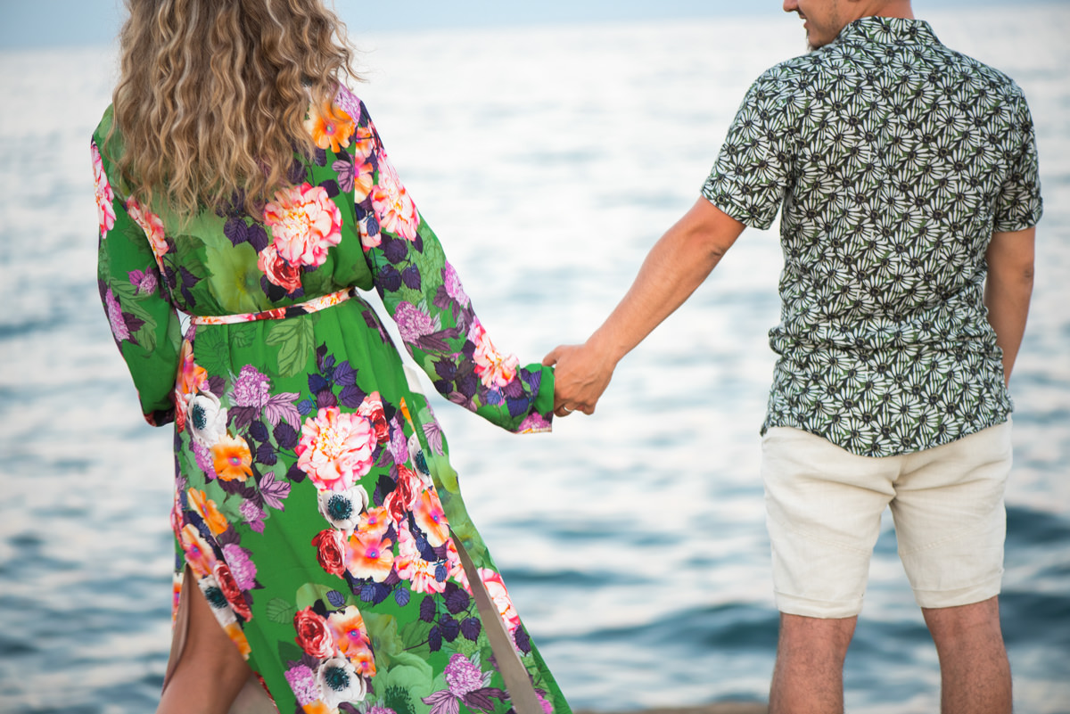 El reportaje lo realizamos un fin de semana, por la tarde, en la playa de Barcelona, con la ciudad sumergiéndose en la noche. La puesta de sol nos regaló momentos espectaculares de luz y Denisa y Stefan nos regalaron retratos muy naturales. Queríamos sorprenderlos tal como son: felices, enamorados, tímidos, alegres; y creo que logramos nuestra meta. Me costó muchísimo no subir todas las fotos.